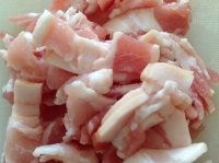 - フライパンにオリーブオイルを入れニンニクを炒め、そこへベーコンを加える。