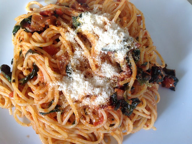 - 茹であがったらフライパンに入れソースが絡まる様によく混ぜながらさっと炒め、お皿に盛って好みでパルメザンチーズをかけて出来上がり。