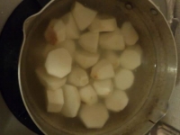 - 塩を軽く洗い流し、小鍋にたっぷりの水と里芋を入れ、火にかけます。 一度沸騰したら、火を止めてざるに返して湯きりします。 里芋のぬめりをとる為ですので、この時、里芋はまだ煮えていなくてもよいです。
