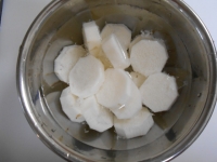 - 長芋は1センチの厚みの輪切りにし、酢水(分量外)に付けぬめりを取る。