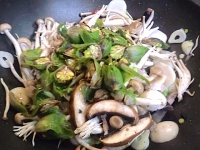 - 香りが立ったらカブを入れて炒め、少し透き通るくらいに火が通ったら、キノコ類、蕗の薹の順に炒め、軽く塩・胡椒します。