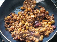 - 火が通ったら、マッシュルームとミックスビーンを炒め合わせます。