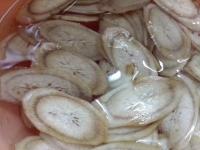 - ごぼうは5ミリ幅に切って、アク抜きのため15分ほど水にさらします。