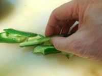 - キュウリをまな板の上に置き、すりこ木やめん棒、またはビンの底などで、叩いて割れ目を入れます。