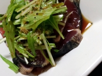 たんぱく質が豊富で脂質の少ないヘルシーな鰹を、シャキシャキした水菜とあわせてサラダにしました。 さらに茗荷をアクセントに散らして、爽やかな初夏の味をお楽しみください。 ドレッシングはめんつゆとお酢で作る自家製です。