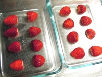 - 容器に半分に切ったいちごを並べます。切り口を下にすると、出来上がりがキレイです。