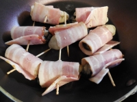 - 半分の長さに切ったベーコンの端に置き、くるくると巻いて、楊枝で止めます。