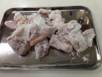 - コーンスターチと片栗粉をよくまぜ、鶏肉にまんべんなくまぶす。