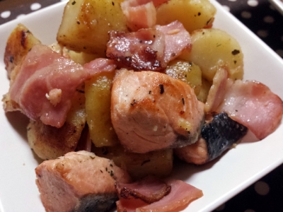 予め加熱したじゃがいもは柔らかくてバターともよく絡みます♪鮭とベーコンの旨味も染み込んで絶品!
