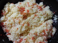 - 熱したフライパンに油をしき、みじん切りにした人参と長葱、小えび、白ごまを炒めます。