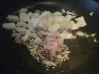 - ベーコンと玉ねぎを入れ更に炒める。