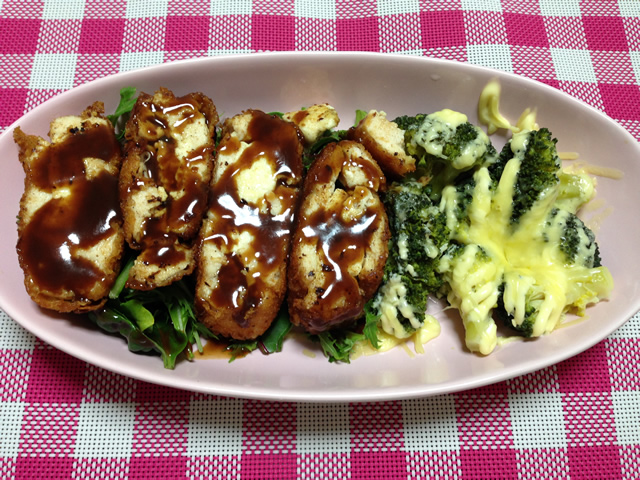 - じっくり揚げて、中まで火が通ったらソースをかけて完成。