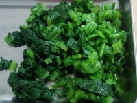 - 小松菜は根を切り落として熱湯で1分ほど茹でます。ザルに上げて冷まし水気を絞って小口切りにします。