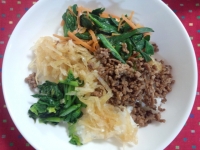 フライパンで簡単に出来るビビンバです。好みでもやし等のナムルや茹でたほうれん草・キムチ・温泉卵・目玉焼き等を混ぜても美味しいです。