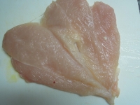 - 胸肉の真ん中に包丁を入れて観音開きにします。