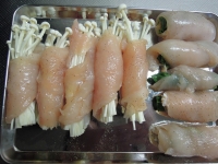 鶏の胸肉を薄く開いて、野菜を巻いて焼いたものに竹串を刺してピンチョスにしてみました。