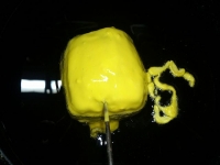 - ボウルに衣用の薄力粉と食用色素(黄色)を入れよく混ぜます。水は通常のてんぷらより固めになるくらいに調整します。からしの具を詰めたれんこんに、軽く薄力粉をまぶし衣をしっかりと付けます。