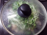 - しめじに火が通ったら、貝割れを乗せて蓋をして弱火で30秒ほど蒸します。