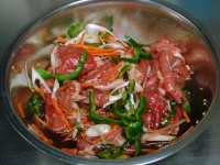 - 材料を準備します。 豚肉は食べやすい大きさに、野菜は全て千切りにします。