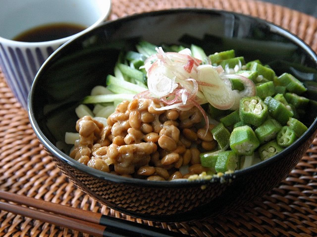 - オクラはサッと茹でて5mmほどの厚さに切り、茗荷ときゅうりは千切りにします。