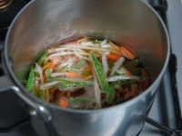 - 鍋に煮汁の材料と野菜を入れて火にかけます。