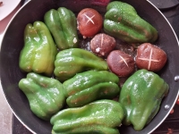 - 熱したフライパンに油をしき、ピーマンの肉面を下にして並べます。蓋をして弱火で5分焼きます。