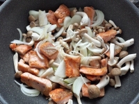- そこにしめじとスライスした玉ねぎを加えて炒め合わせます。