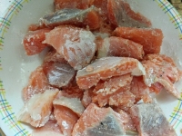- 生鮭は骨を抜いて一口サイズに切ります。塩胡椒を揉み込み、小麦粉をまぶします。