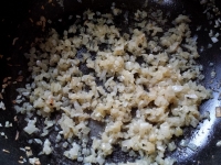 - 熱したフライパンにバター(大さじ2)をしき、みじん切りにした玉ねぎを飴色になるまで15分ほど炒めます。