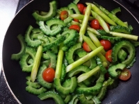- 熱したフライパンに油をしき、塩揉みしたゴーヤ、4cm幅に切ったアスパラガス、半分に切ったミニトマトをよく炒めます。