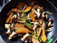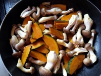- 熱したフライパンにバターをしき、2ミリ幅に切ったかぼちゃと細かく切ったベーコンを炒めます。