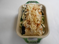 - 更にシュレッドチーズ(ピザ用とろけるチーズ等)をのせ七味唐辛子をふりかける。
