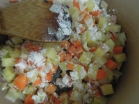 - ジャガイモの表面が透明になったら小麦粉を加えて炒めます。焦げやすいので注意。
