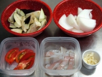 - 材料を切ります。 ナスは乱切り、玉ねぎ、トマトはくし切りにします。 イカは食べやすく輪切りにし、にんにくはみじん切りしておきます。
