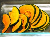 - かぼちゃは皮付きのまま3mm程度の厚さにスライスします。