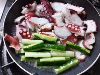 - 熱したフライパンで細切りにしたキュウリを炒めます。しんなりしたらタコ(漬け込み汁ごと)を加えて炒め合わせたら完成です。