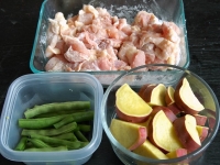- 鶏肉は一口大に切り、塩コショウをして片栗粉をまぶしておきます。 インゲン豆は5cmほど、さつまいもは食べやすい大きさに切ります。