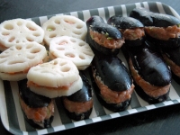 茄子とれんこんの挽肉はさみ揚げの作り方
