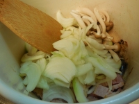 - 玉ねぎが透き通ってきたら、シーフードミックスを加え、更に炒めます。
