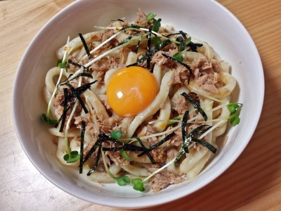 - そこに加熱したうどんを加えて、まんべんなく全体に絡めたら完成です。