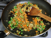 - フライパンに油を敷いて、具を炒めます。塩コショウ、しょうゆ、砂糖、カレーパウダーで味付けします。