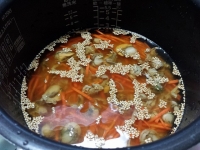 - そこに、ベビーほたて、千切りにした人参、白ごまを加えて炊きます。