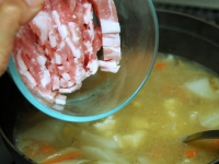 - 豚肉とサツマイモを入れて一煮立ちさせます。