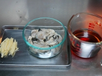 - 材料を準備します。牡蠣は水で良く洗い、しょうがは針ショウガにしておきます。水、酒、みりん、醤油を合わせて煮汁を作っておきます。お米は研いでざるにあげておきます。