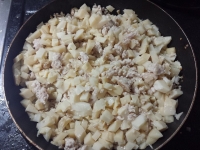 - 鶏挽き肉に火が通ったら、粗みじん切りにしたたけのこ水煮を加えて炒め合わせます。