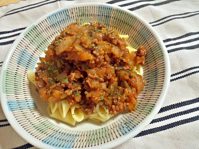 - ペンネの上にたっぷりのミートを乗せて、乾燥パセリを散らして下さい。