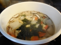 - 鍋に、野菜とわかめ、たっぷりの出し汁を入れて火にかけます。