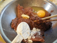 - ボールにイワシのすり身、卵、おろし生姜、小麦粉を入れて、よく練ります。
