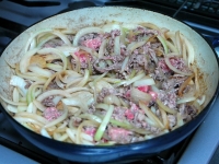 - 玉ねぎに火が通ってきたら牛肉を加えて炒めます。