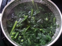 - 春菊は2cm幅に切って、3分ほど湯でます。(少し歯応えが残るくらいがベスト!)